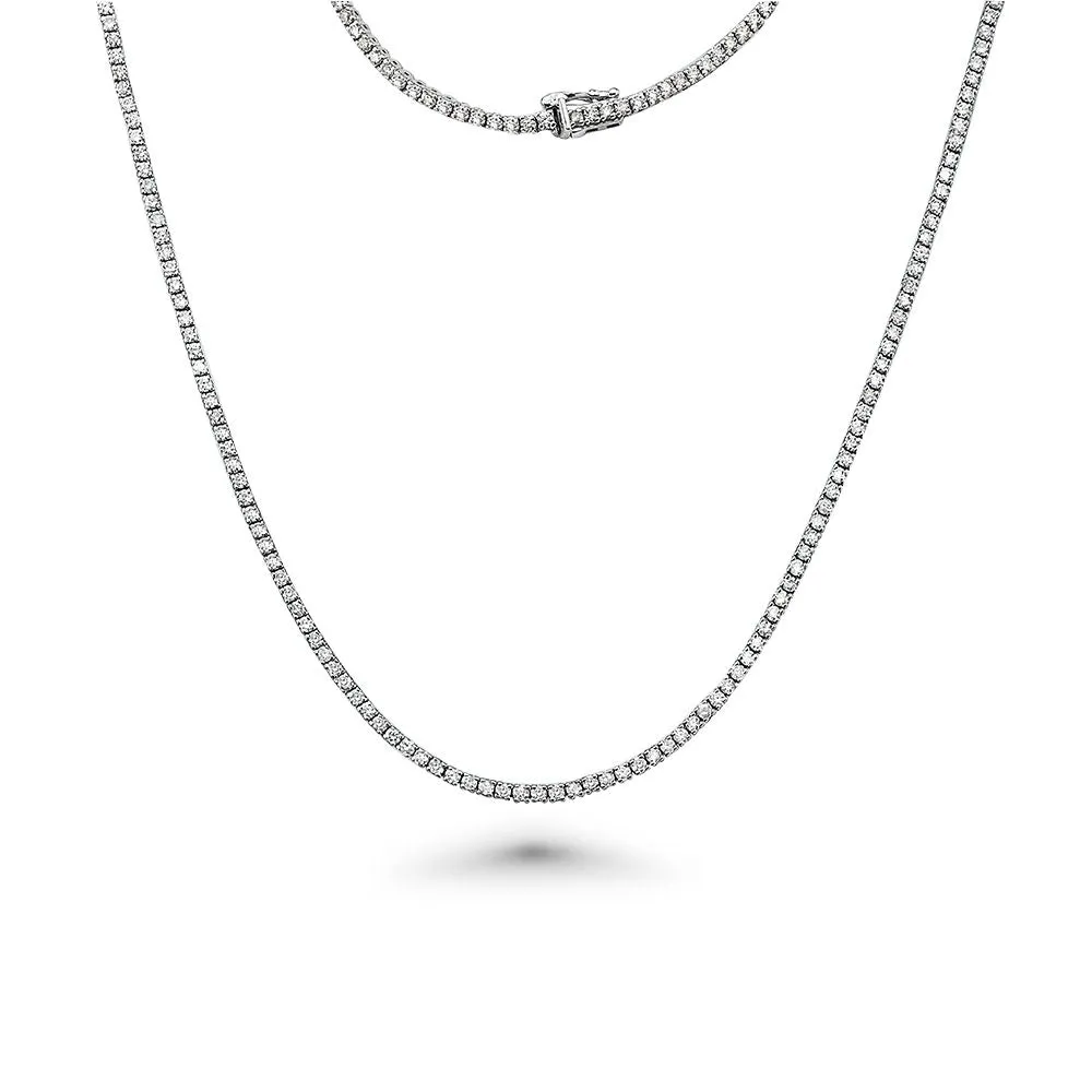 The Diamond Tennis Necklace is an exceptional piece of jewelry that boasts a total of 9.30 carats of high-quality diamonds set in 14K gold. Each diamond is secured by a 4-prong setting, which ensures that they are held securely in place while allowing them to shine brilliantly.